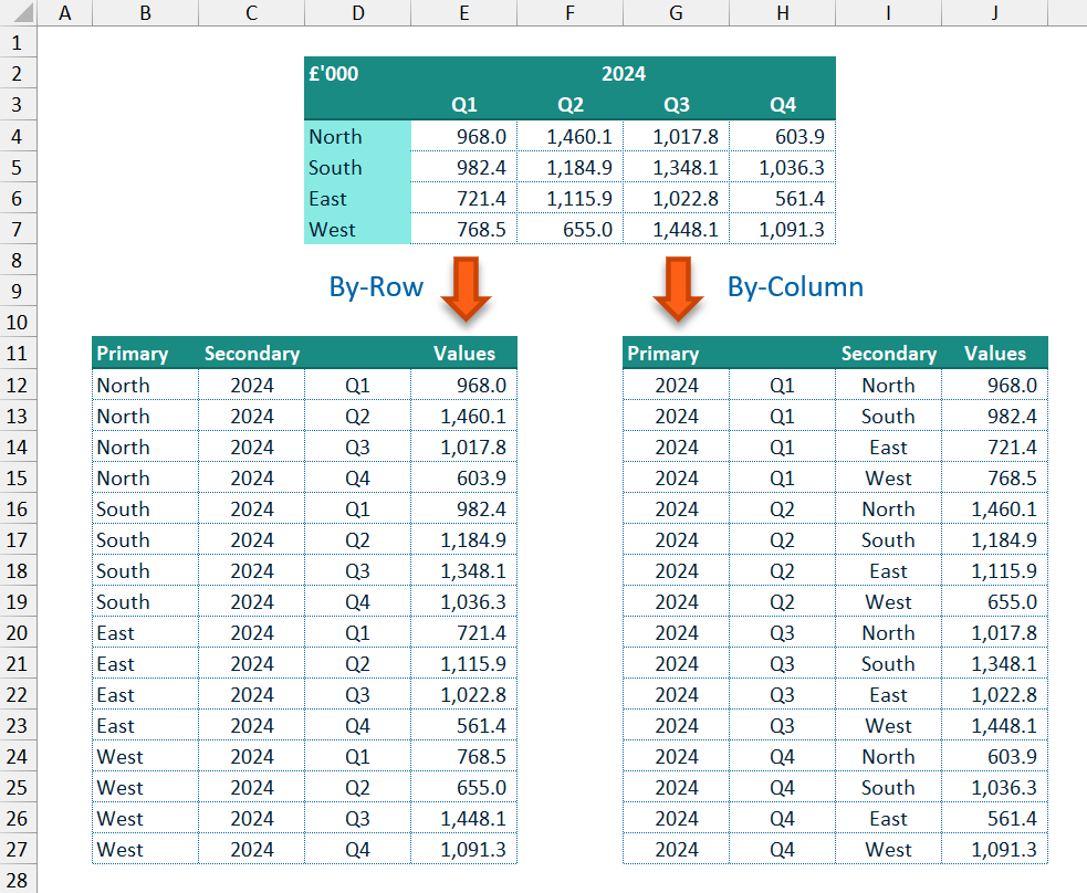 Achieving this kind of unpivoted data table is simple when done manually but can be time consuming and will need updating when the underlying data changes. Alternatively, a more dynamic approach to the unpivoting could be achieved using look-up formulae, but this would likely need manually updating if the structure of the underlying data table is changed, e.g. if rows or columns are added/removed in the underlying data table.